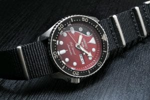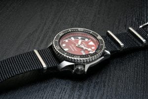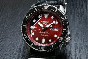 To this end, the dial of the new Seiko 5 diver has the same red and black color scheme as the “Red Special” and features the delicate wood-like pattern that is seen on the body of the guitar.