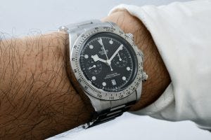 The Black Bay Chronograph though on a bracelet, sized for me, comes in at about 158 grams, which is on my personal border of comfort.