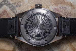 Round the back, there is an engraving of a rat, wearing old school driving goggles and holding a steering wheel, a fitting tribute to the motor racing roots of TAG Heuer.