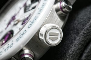 The colour combination is very unique, as the watch comes with a ceramic bezel, partially skeletonised dial, crown rubber coating and rubber strap in white. As a counterpoint to this, it comes with purple in the chronograph hours, minutes and seconds hands and the titanium tourbillon cage.