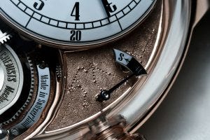 Situated at 8 o’clock is a variable inertia balance wheel with weight screws connected to a blued cylindrical hair spring, with a power reserve indicator from 0-72 hours just above that to the left of the hour/ minute sub-dial. Opposite to this, between 2 and 3 o’clock, is a function selector, with W, indicating (Winding) or S, indicating (Setting). At 4 and 7 o’clock on either side of the small seconds sub-dial, there are two barrels, linked in parallel and connected to moustache-shaped pawls that allow users to see each click of the ratchet when the watch is being wound.