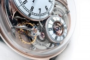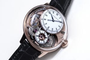 In two words – Philippe Dufour. Well, not the master himself who does the work, but watchmakers that he trained in the traditional arts of finishing, and whose work is overseen and approved by him. Well that got your attention didn’t it? And might account for the relatively high asking price of 214,107 CHF for a time only watch.