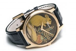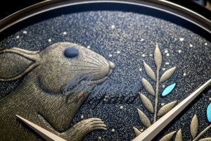 This year, it’s the L.U.C XP Urushi Year of the Rat that comes to the fore, with a dial that depicts a golden rat standing on an ear of corn, a symbol of abundance, and in front of a persimmon, a symbol of longevity, along with a bouquet of flowers that depict the three lucky colours of its zodiac sign – blue, gold and green.