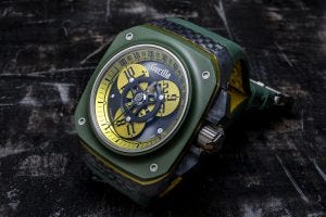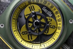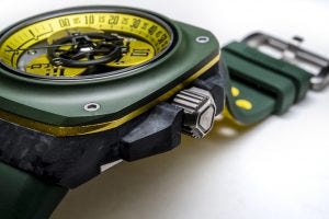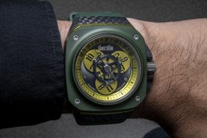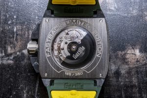 Have a look at the latest variant of the watch, the Fastback GT Drift Elise, this time with a colour combination of green and yellow that is extremely fetching. In this case, we have the same layered construction that we’ve come to expect from Gorilla watches, with a sapphire crystal over a matte ceramic bezel, an anodised aluminium “pinstripe” and a woven forged carbon case. The colours here are inspired by British racing liveries.