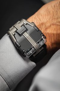 The hours jump in one hour increments, energy for which is accumulated during the rotation of the minutes satellites. At the 60th minute, the energy is released, enabling the switch-over of the hours satellites. The minutes satellites are marked in 5 minute intervals, with minute graduations starting from 0 shown to the right of the minutes satellites, indicating the precise time when added to the number shown on the satellite. This curious time display is one that Urwerk is most famed for, and more incredibly, is powered by a single source of power. Felix Baumgartner states “We nicknamed the watch the Aggregat, because the UR-112 brings different elements together” – a fitting name, given its technicality of its movement and its complex case design.