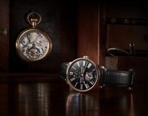 Housed within a 42mm rose gold case, the watch again exhibits great classic Marine Chronometer traits with its large Roman numerals, as well as the power reserve indicator at 12 o’clock. The dial is crafted from black Grand Feu enamel, from the famed Donze Cadrans, Ulysse Nardin’s enamel specialist, and the watch is mounted on a black alligator strap with rose gold deployant buckle. The watch is also compatible with a Ulysse Nardin rubber strap, or the brand’s eco-friendly R-Strap.