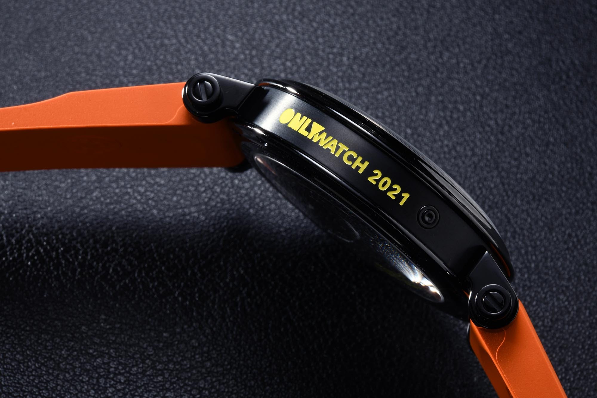 Contrasting with 42mm DLC coated case is an orange dial that is the thematic colour of this year’s edition of Only Watch, not only representing hope and progress in the world of Duchenne Muscular Dystrophy research, but also a reminder of the reemerging world.