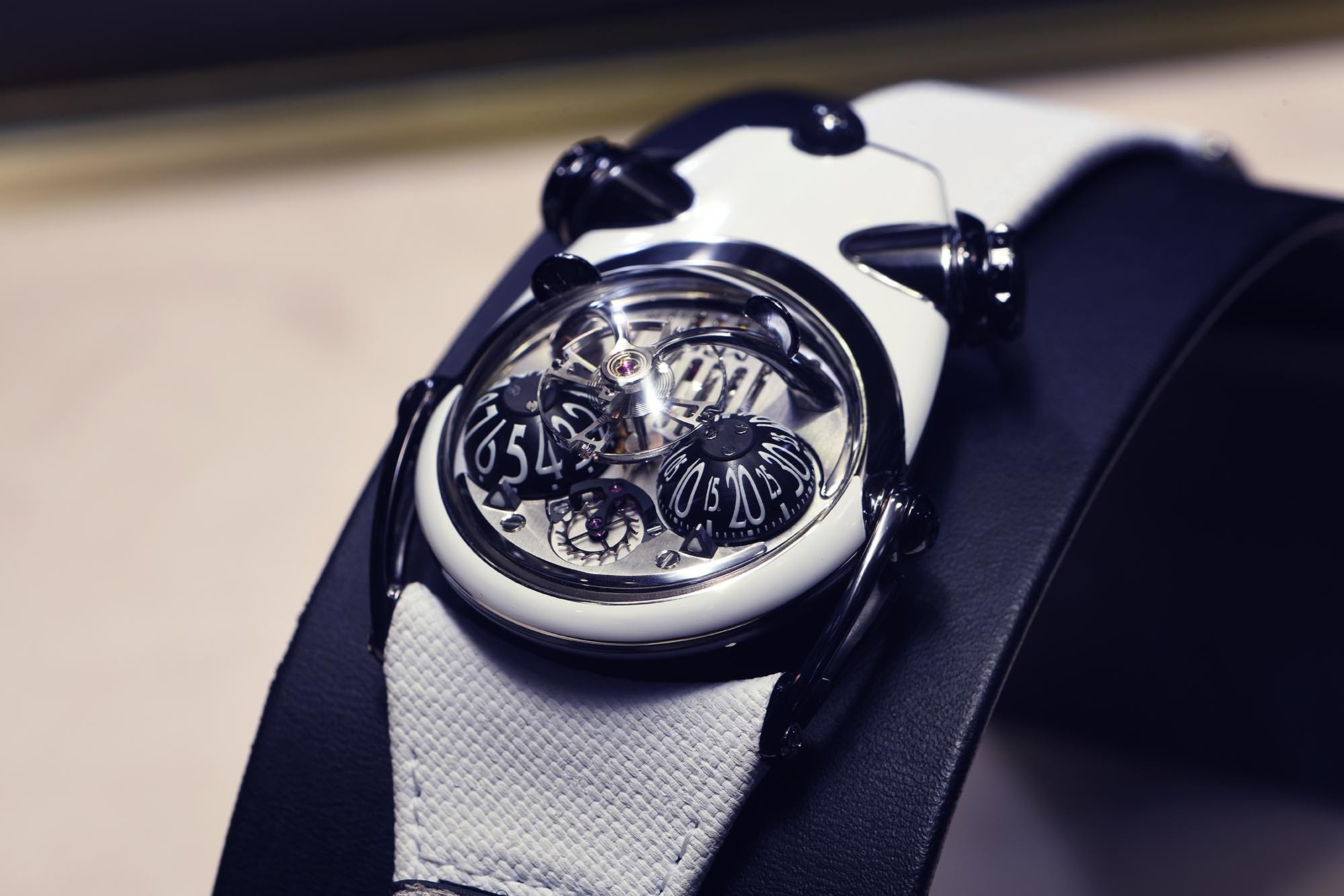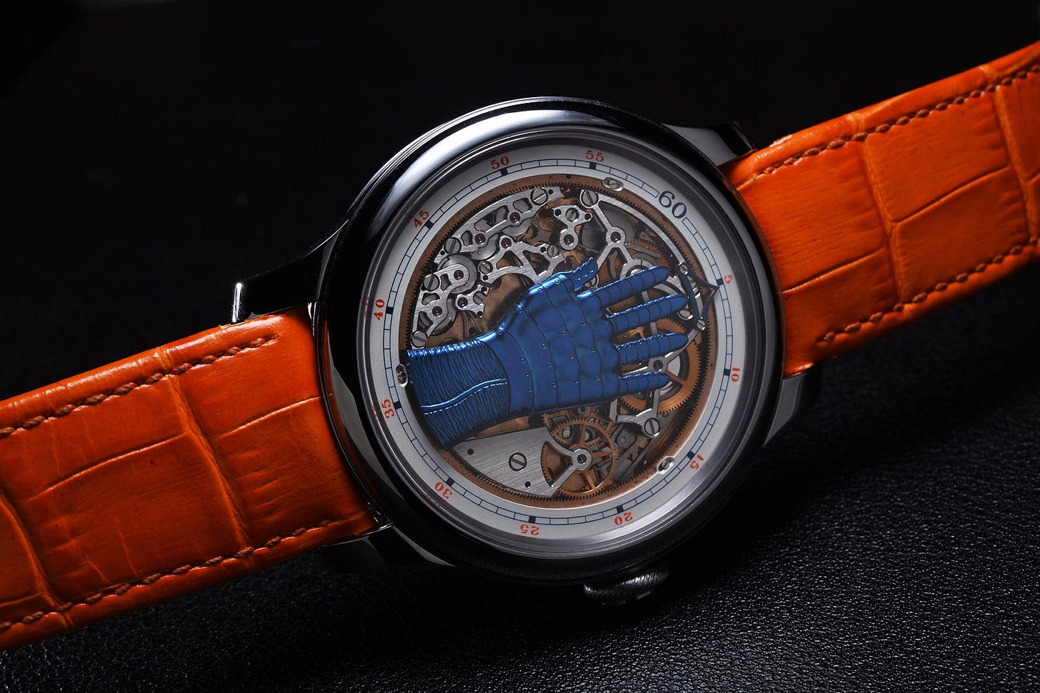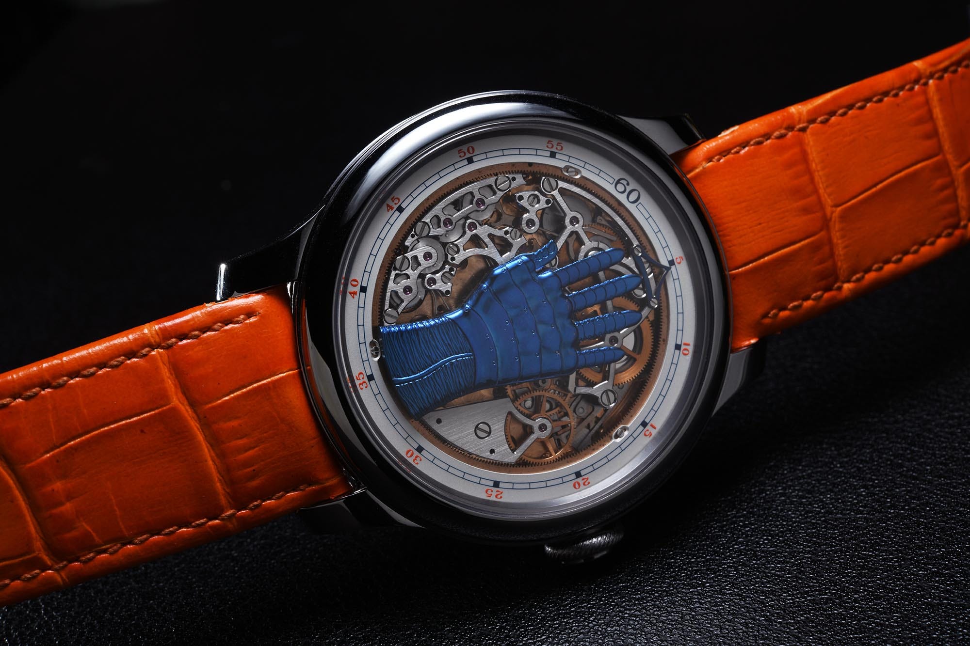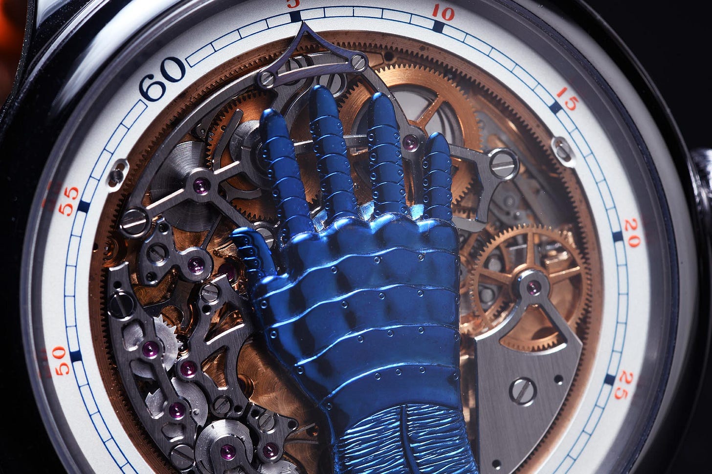 The minutes are displayed on a disc on the periphery of the dial with a blued triangular arrow, and of course, the “digital” hours are indicated by the blue hand in the centre of the dial. Whilst we can certainly think of ways that this watch can be even more provocative through the use of its middle digits, this watch is certainly provocative enough with its radical display of time, and incorporation of automata in its construction.