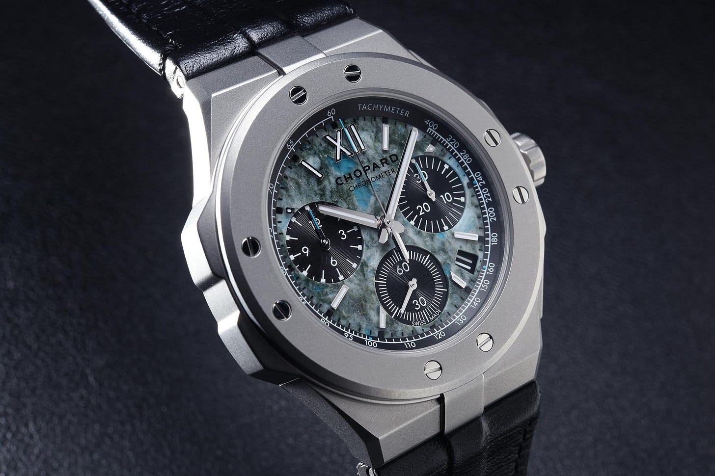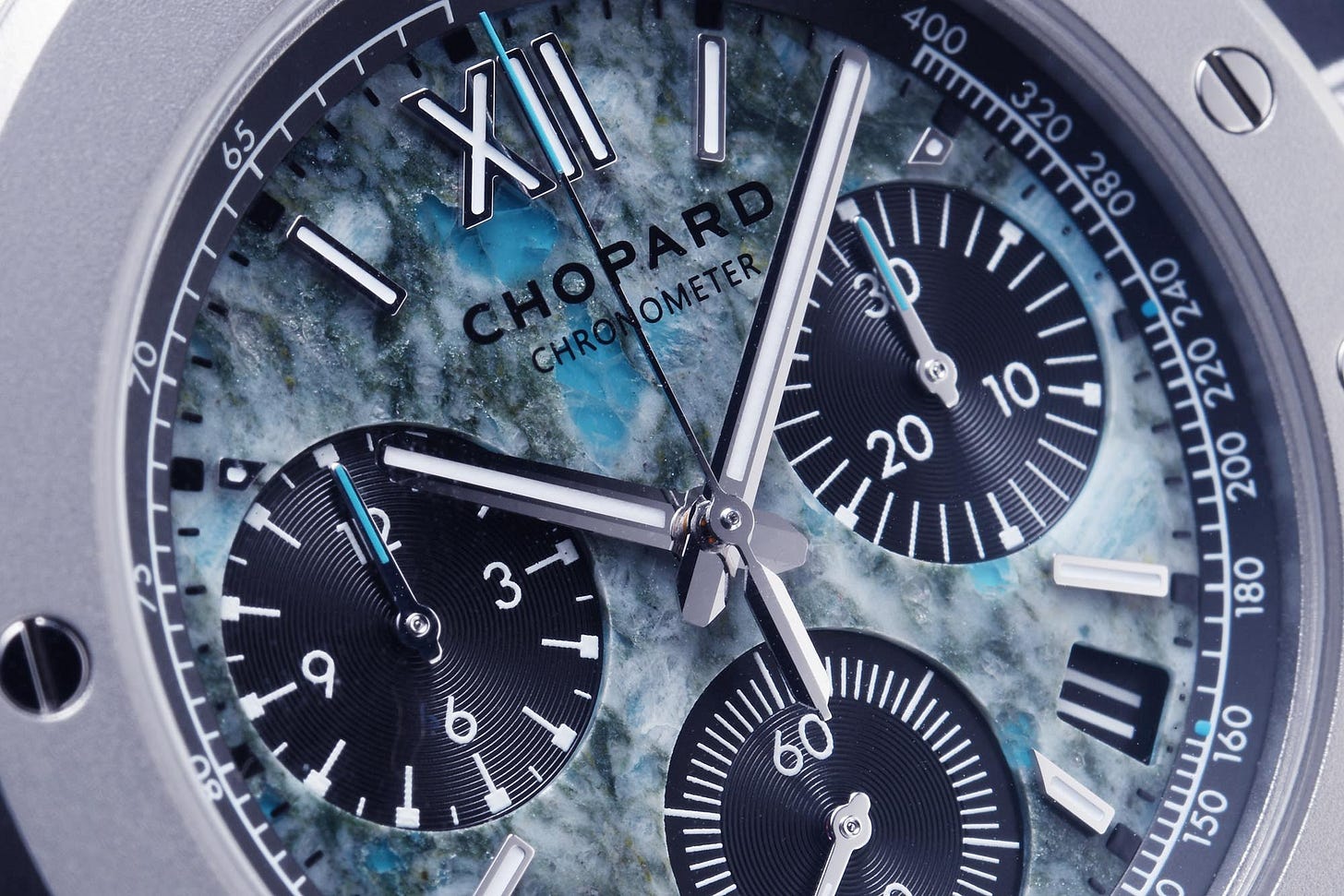 Naturally, in order to view the beauty of the stone dial, the sapphire crystal has the brand printed onto it. The 44mm case is made from Lucent Steel, the same as in the main line collections where a portion of the steel used is recycled – this steel is also harder than traditional 316L Stainless Steel used in many watches. Housed within the fantastic steel case is the Chopard 03.05-C movement, for which 3 patents are filed for the chronometer certified movement, and the watch is delivered on a calfskin strap with a titanium inlay.