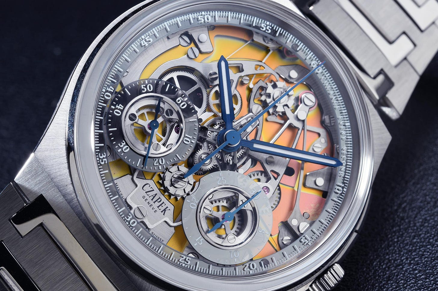 The movement itself is also the fruit of a partnership – with Chronode, no less. The SHX6 movement displays the entire split seconds chronograph mechanism on the dial side, to display the beauty of its finishing, and the mechanical interactions each component plays when the chronograph is activated.