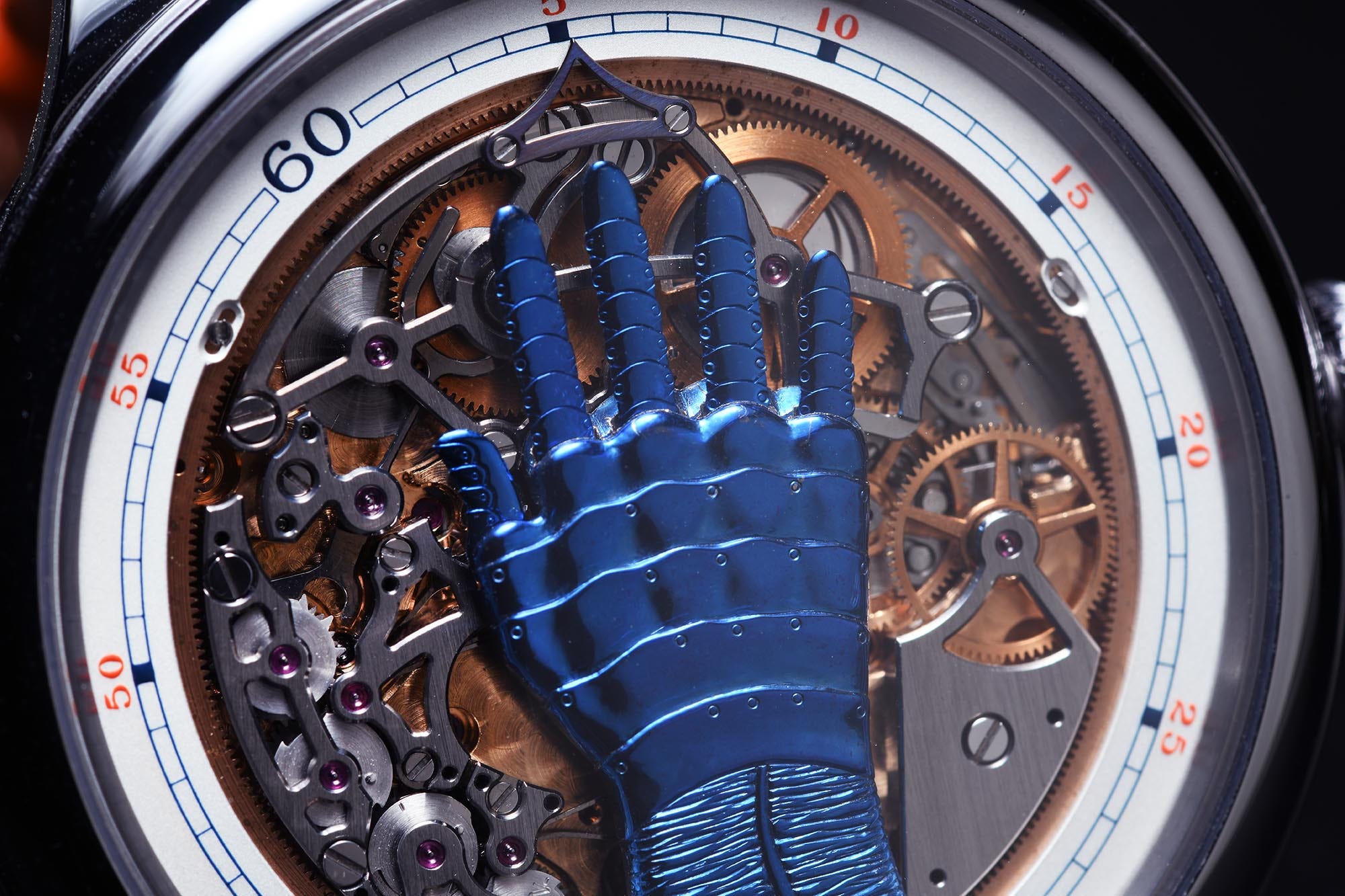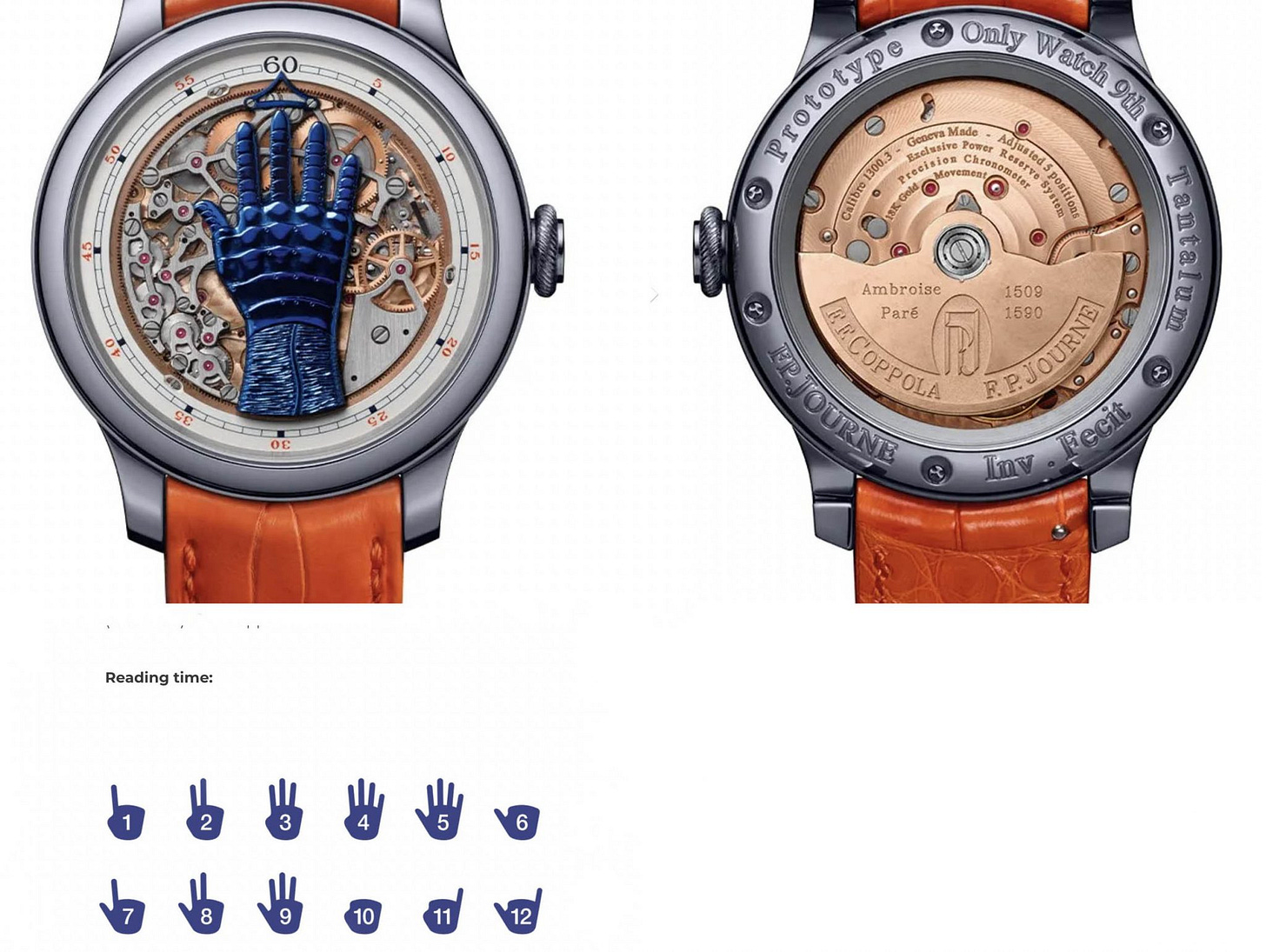 Taking an incredible 7 years from conception to development, the FFC Blue was inspired during a dinner between Coppola and Journe, with Coppola asking if there was any possible way for a watch to tell the time with a hand – and not in the sense that we are used to in watchmaking. Journe took the inspiration of this display from a mechanical hand created by Ambroise Pare, the father of modern surgery, and had to devise a way to display all 12 hours with only 5 fingers.