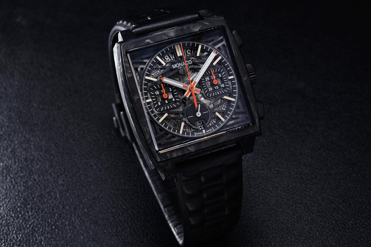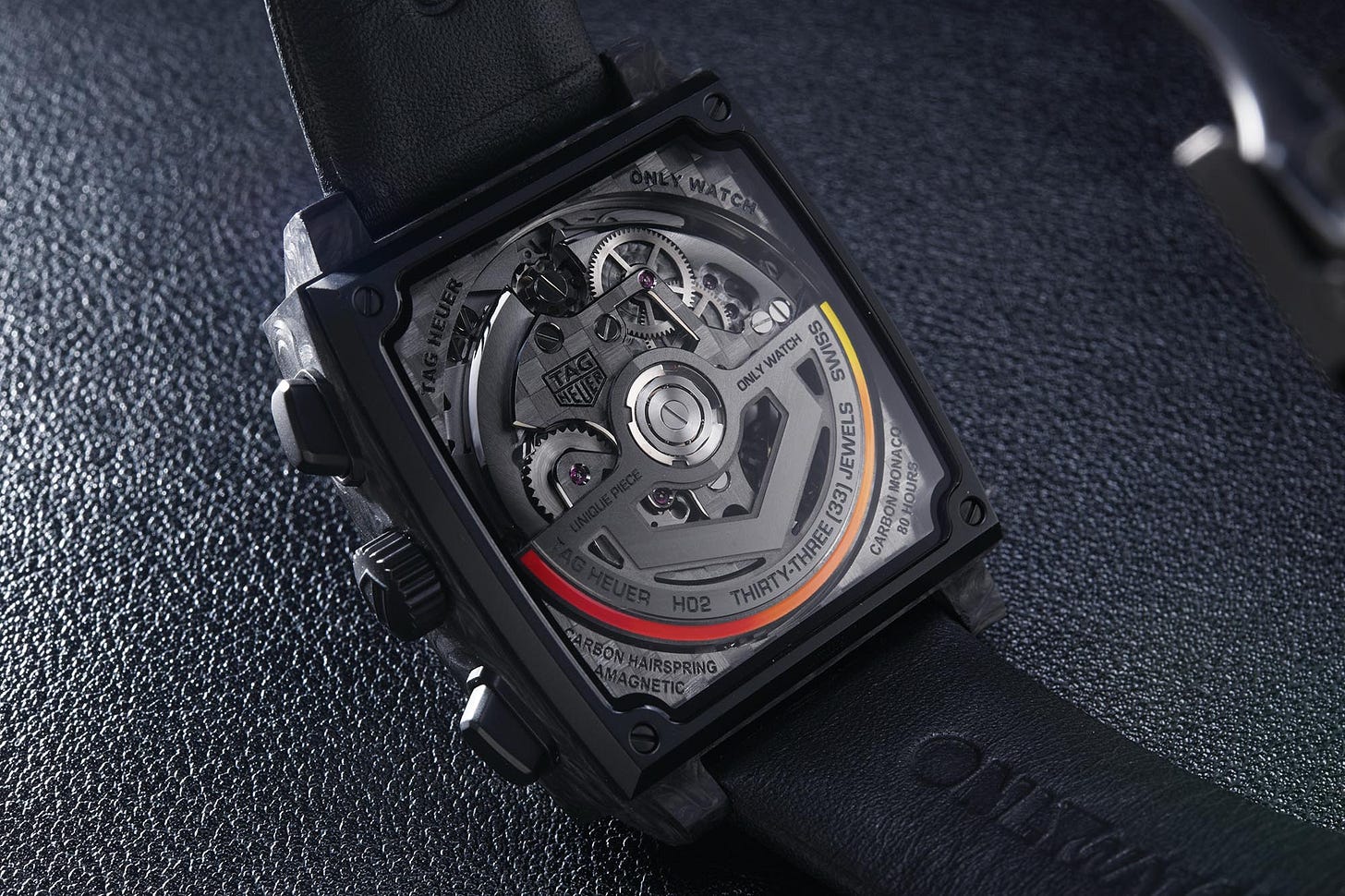 The movement features a ‘gratte’ finish to echo a finishing flag that brings to mind its racing heritage, and the rear of the watch features the largest sapphire crystal case back to ever be featured on a Monaco. Within the forged carbon case is the Heuer 02 in-house movement, that is curiously fitted with a carbon hairspring – continuing the theme of carbon within the movement. It is fantastic to see that the carbon hairspring has made its way back to a production watch, and we can only hope that it is a signal for things to come.