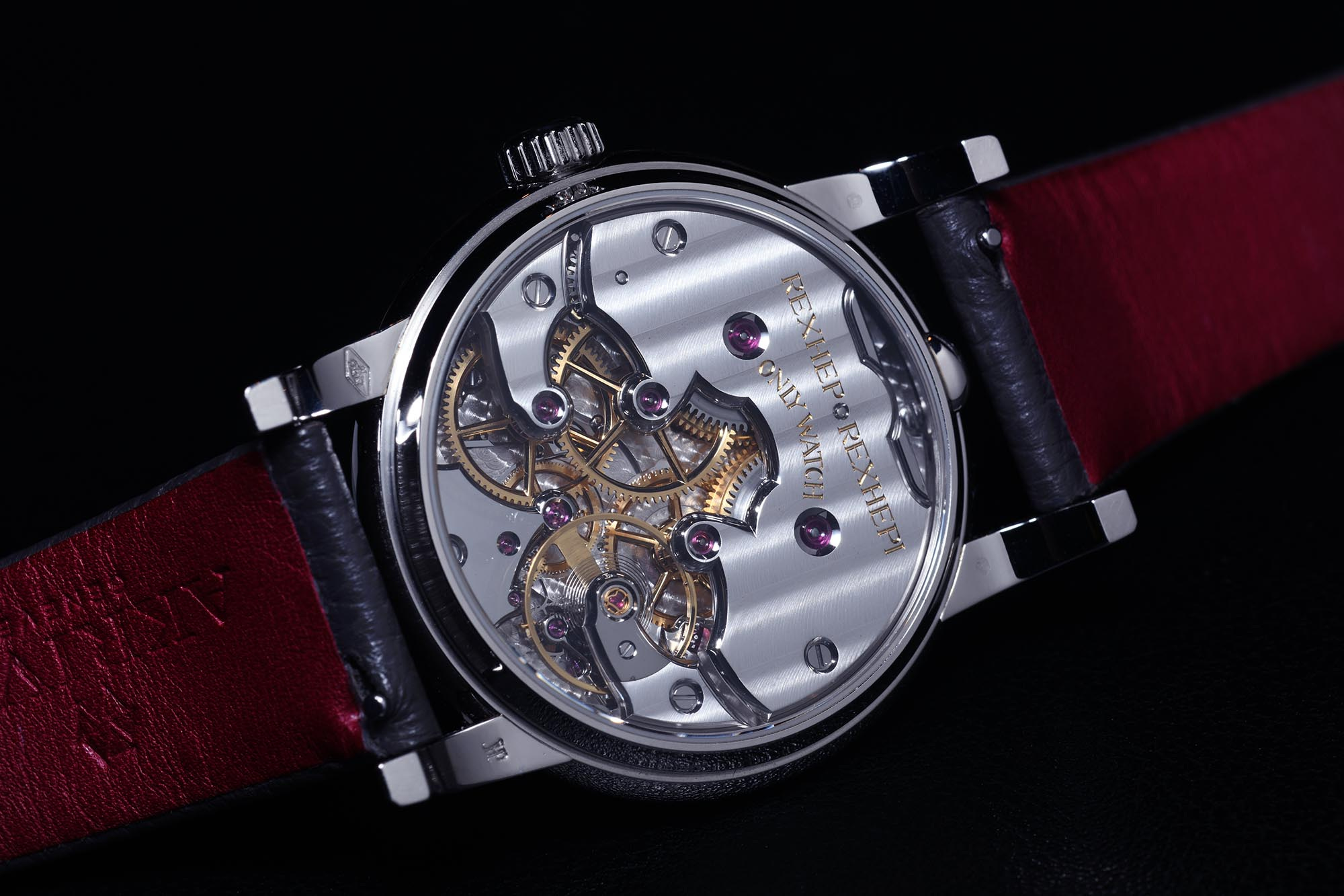 A dial with a two-stage production process of grand-feu enamel, followed by a translucent champagne-coloured flinque enamel graces the front of the watch.l The case, hewn from 950 Platinum respects traditional craftsmanship, and is produced in 14 parts by Jean-Pierre Hagmann – a boitier/casemaker by trade who has been lauded for his minute repeater cases, manufacturing for numerous brands in the past and is now working with Rexhepi. The “JHP” hallmark on the lugs signifies its provenance, and each of these lugs are individually soldered to the case.