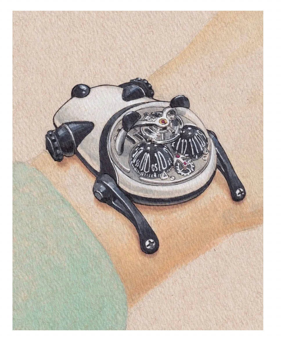 The shape of the “bulldog” lent itself well to an iteration of this watch in Panda form, with its rounded edges and organic forms. To further the Panda aesthetic, titanium ears were added to domed upper sapphire crystal, the upper case was reworked in stainless steel to accept a black and white lacquer finishing, and a silicon nitride ball was used for its tail. As the Panda is always munching on bamboo, the teeth remain underneath the “eyes/hour and minutes indicators” of the panda – this also serves to indicate the power reserve. To top it all off, the Panda motif is further reinforced with a black and white velcro strap.