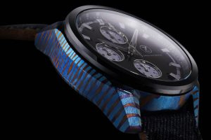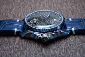 Then there is their use of a case material called “Timascus”, which basically comes from the words – “Ti” for titanium and “Damascus”. Essentially it is created by having Grade 5 and Grade 2 titanium repeatedly folded and forged to induce the wood-like wave pattern reminiscent of Damascus steel, then heat treated to form a blue oxidation layer. Given the different grades of titanium that the case is composed from, the wave like pattern persists after the heat-treatment, and the result is a crazy looking effect. This type of case is unique to Zelos, since they are the only brand thus far that has offered titanium cased watches like this.