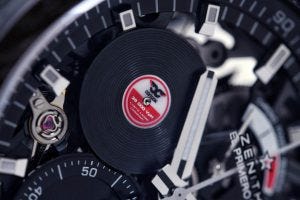 The main clue to the Carl Cox link is the running small seconds at 9 o’clock, which in this case is made to look like a miniature vinyl record turning, which is fitting since Cox is known for three-deck mixing in his DJ sets. The vinyl record is decorated with his name and the speed of the movement “36,000 vph 1/100th of a second chronograph.” On this point, it’s nice that the relatively fast beats of techno music fit well with the high beat of the El Primero movement beating within.
