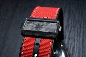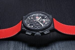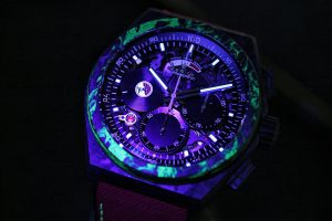 The last detail has to be the best one of all. Just think about it – just where does Carl Cox spend most of his time when he is working. Well, in a darkened club. But what goes well with a darkened environment then? How about the standard Super-LumiNova painted hands and indexes, and then top it off with a luminous carbon bezel, and luminous stitching on the black rubber with red “Cordura effect”strap?